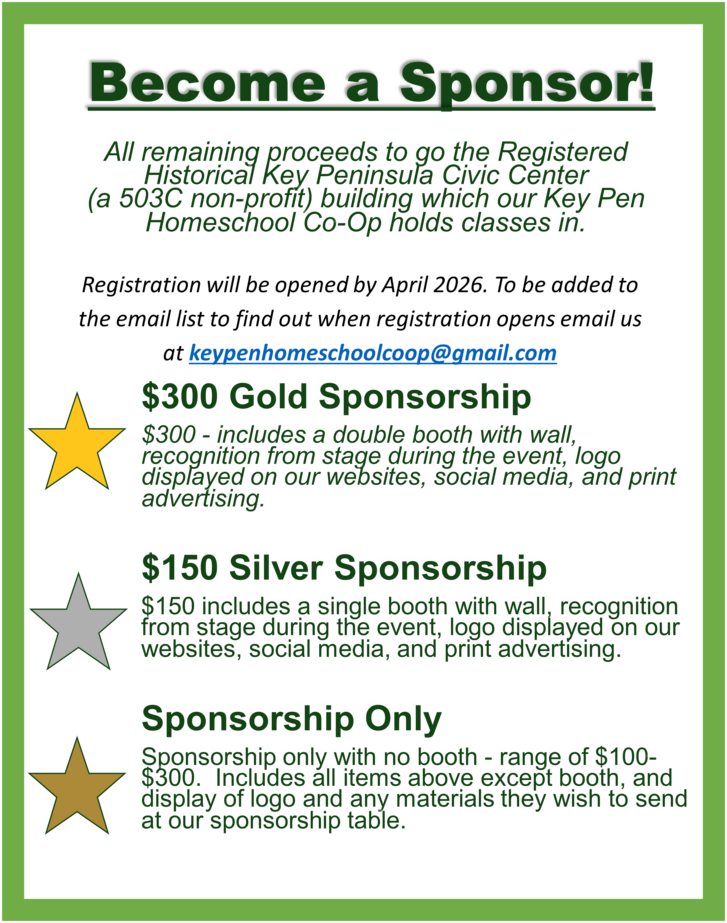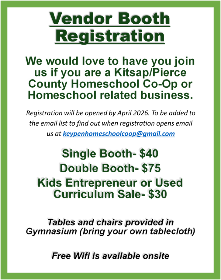 Mark your calendars and join us for the 3rd Annual Peninsula Homeschool Fair on Saturday June 13, 2026, from 1–6 p.m. at the Key Peninsula Civic Center in Vaughn, WA! This exciting event is designed to connect homeschooling families with invaluable local resources, including homeschool-related services, businesses, and co-ops. Get inspired in one (or more) of the 6 speaker sessions, explore a marketplace of young entrepreneurs showcasing their talents, enjoy delicious food, family-friendly fun, and build connections and in your homeschool community. Don’t miss out on this opportunity to learn, shop, and grow alongside fellow homeschooling families!